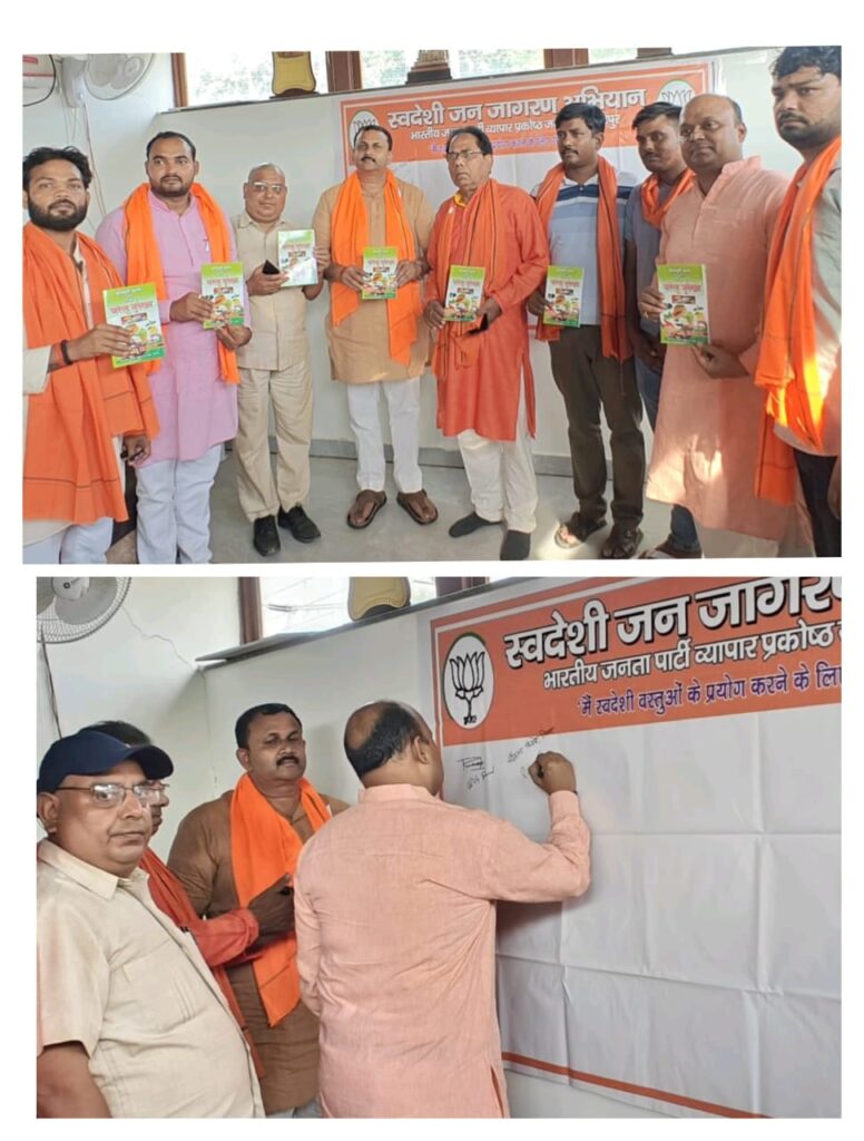 जनपद गोरखपुर भारतीय जनता पार्टी व्यापार प्रकोष्ठ गोरखपुर जनपद के शीर्ष नेतृत्व के निर्देश पर जिला सह संयोजक कौशल निगम के कुशल नेतृत्व में पिपरोली मंडल और सहजनवा मंडल में स्वदेशी जन जागरण अभियान के तहत हस्ताक्षर अभियान का आयोजन किया गया।इस कार्यक्रम में विशिष्ट अतिथि के रूप में लोकप्रिय सहजनवा विधायक प्रदीप शुक्ला और क्षेत्रीय संयोजक भोला अग्रहरी उपस्थित रहे। दोनों अतिथियों ने व्यापारियों को जीएसटी रिफॉर्म और स्वदेशी उत्पाद अपनाने के महत्व के विषय में विस्तार से जागरूक किया।कार्यक्रम के दौरान स्वदेशी के प्रतीक के रूप में प्रवीण सिंह के पिताजी द्वारा रचित “घरेलू नुस्खे” नामक पुस्तक माननीय विधायक प्रदीप शुक्ला और अन्य गणमान्य पदाधिकारियों को भेंट स्वरूप दी गई।जिला कार्यक्रम प्रभारी प्रवीण सिंह ने बताया कि स्वदेशी जन जागरण अभियान का मुख्य उद्देश्य व्यापारियों और आम जनमानस में स्वदेशी उत्पादों के उपयोग को बढ़ावा देना तथा जीएसटी सुधारों की जानकारी देना है। इस तरह के अभियान समाज को आत्मनिर्भर भारत की दिशा में प्रेरित करते हैं। प्रवीण सिंह बताया कि अभियान को सफल बनाने में स्थानीय विधायक, भाजपा कार्यकर्ताओं तथा स्थानीय व्यापारियों का पूरा सहयोग मिला।स्थानीय व्यापारियों और समाजसेवियों ने इस पहल की सराहना की और आभार जताया कि ऐसे कार्यक्रम व्यापारियों को सशक्त करने और स्वदेशी उत्पादों के प्रति जागरूकता बढ़ाने में महत्वपूर्ण भूमिका निभाते हैं।