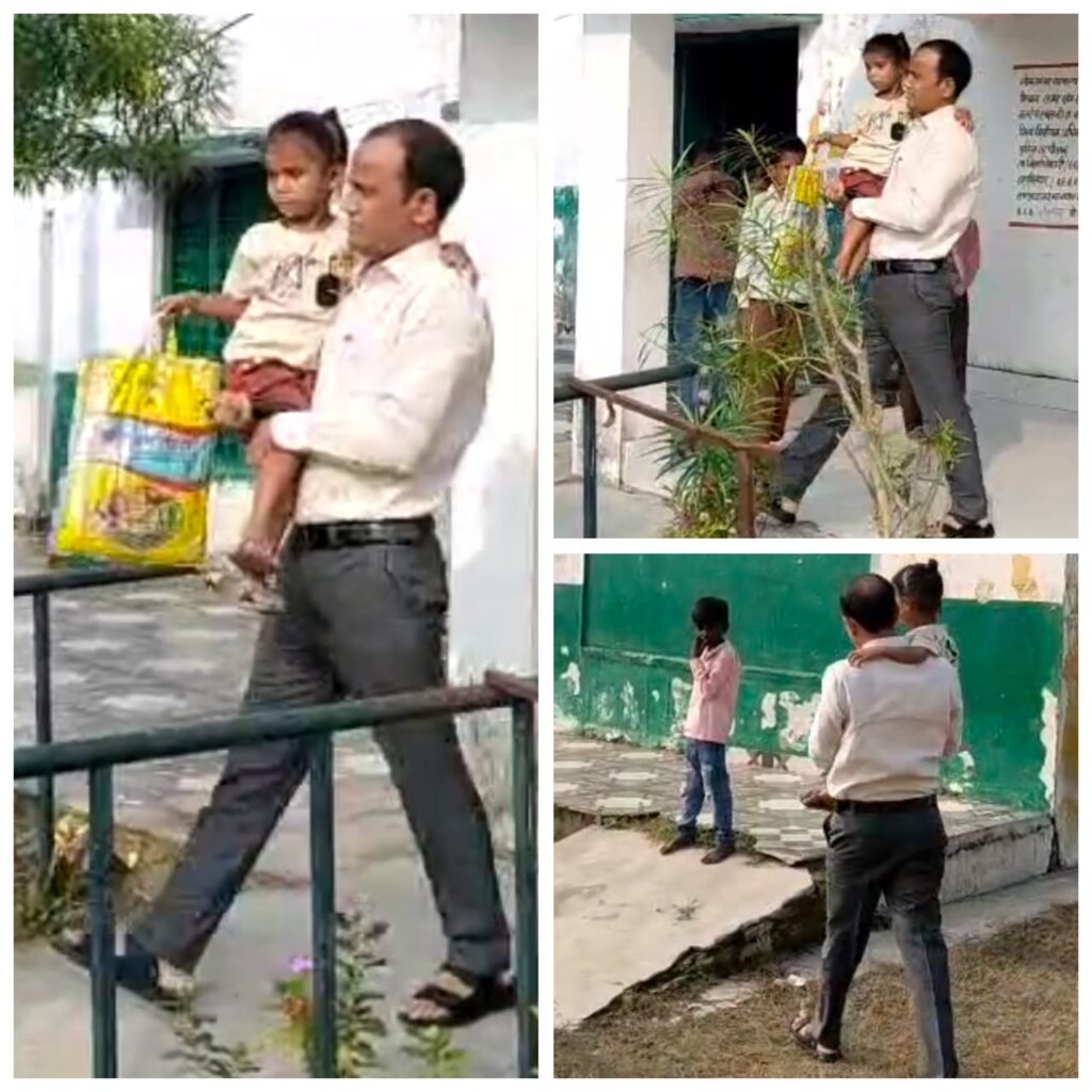एक बच्ची को अपनी गोद में लेकर स्कूल के अंदर जा रहे यह शख्स कोई अभिभावक या आम इंसान नहीं बल्कि जनपद लखीमपुर खीरी के जिला बेसिक शिक्षा अधिकारी प्रवीण कुमार तिवारी हैं।यह तस्वीर और इसका वीडियो सोशल मीडिया पर तेजी से वायरल हो रहा है।हर कोई बीएसए साहब की इस संवेदना की तारीफ कर रहा है।