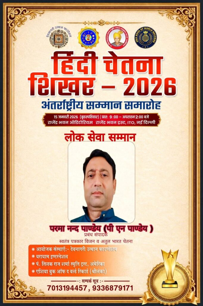 जनपद गोरखपुर हिंदी पत्रकारिता के क्षेत्र में अपनी सशक्त लेखनी, निर्भीक विचारों और जनहित से जुड़े मुद्दों को प्रमुखता से उठाने वाले वरिष्ठ पत्रकार एवं संपादक पी. एन. पाण्डेय को वर्ष 2026 के प्रतिष्ठित ‘हिंदी चेतना शिखर सम्मान’ (लोक सेवा सम्मान) से सम्मानित किया जाएगा। यह सम्मान समारोह नई दिल्ली स्थित राजेंद्र भवन में आयोजित होगा, जहाँ देशभर से साहित्य, पत्रकारिता और लोकसेवा के क्षेत्र में उल्लेखनीय योगदान देने वाली विभूतियाँ उपस्थित रहेंगी।स्वतंत्र पत्रकारिता के सशक्त हस्ताक्षर के रूप में पहचाने जाने वाले पी. एन. पाण्डेय, स्वतंत्र पत्रकार विजन एवं अतुल भारत चेतना के प्रबंध संपादक हैं। उन्होंने लंबे समय से सामाजिक सरोकारों, लोकतांत्रिक मूल्यों, जनसमस्याओं और राष्ट्रहित से जुड़े विषयों को अपनी पत्रकारिता का केंद्र बनाया है। उनकी लेखनी ने न केवल पाठकों को जागरूक किया है, बल्कि कई बार नीतिगत विमर्श को भी दिशा दी है।उनके इस सम्मान पर पत्रकारिता जगत में हर्ष और गर्व का माहौल है। इसी क्रम में पूर्वांचल न्यूज़ 24 की गोरखपुर टीम की ओर से उन्हें हार्दिक शुभकामनाएं प्रेषित की गई हैं।