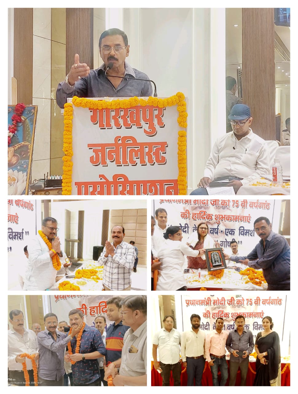 जनपद गोरखपुर प्रधानमंत्री नरेंद्र मोदी के 11 वर्षों के कार्यकाल को एक चर्चा में बांधना असंभव है। मोदी ने अपनी विराट सोच से अथाह सागर के कार्यों को गागर में समाहित कर भारत को असीम गौरव प्रदान किया है।यह विचार गोरखपुर जर्नलिस्ट एसोसिएशन (गोजए) द्वारा स्थानीय होटल में आयोजित “मोदी के 11 वर्ष – एक विमर्श” कार्यक्रम में महापौर डॉ. मंगलेश श्रीवास्तव ने व्यक्त किए। उन्होंने कहा कि मोदी ने भारत को पूर्ववर्ती सरकारों की छवि से अलग हटकर पुनः विश्व गुरु बनने की दिशा में अग्रसर किया है।इस कार्यक्रम का आयोजन गोरखपुर जर्नलिस्ट एसोसिएशन (गोजए) ने किया था, जिसका उद्देश्य विभिन्न क्षेत्रों के लोगों की राय लेकर पत्रकारिता के माध्यम से समाज तक पहुंचाना था।गोजए के अध्यक्ष रत्नाकर सिंह ने अतिथियों का स्वागत और विषय प्रवर्तन करते हुए कहा कि पत्रकार समाज की सोच को शब्द देता है। इसी सोच को सामने रखने के लिए यह विमर्श आयोजित किया गया है। उन्होंने गोजए के सभी पदाधिकारियों और पत्रकारों को धन्यवाद दिया, जिनके सहयोग से इतना बड़ा कार्यक्रम संभव हुआ।मुख्य अतिथि पं.दीनदयाल उपाध्याय गोरखपुर विश्वविद्यालय की कुलपति प्रो. पूनम टंडन ने कहा कि मोदी की विराट सोच ने शिक्षा,रक्षा, चिकित्सा,वाणिज्य और ग्रामीण क्षेत्रों में अद्भुत प्रगति कराई और देश को नई ऊंचाइयों तक पहुंचाया।मुख्य वक्ता पूर्वोत्तर रेलवे के मुख्य जनसंपर्क अधिकारी इंजीनियर पंकज कुमार सिंह ने कहा कि मोदी ने सुदृढ़ और स्वच्छ भारत के संकल्प से भारत की अंतरराष्ट्रीय छवि बदली है।विशिष्ट वक्ता बुद्धा पीजी कॉलेज हिन्दी विभाग के प्रोफेसर डॉ. गौरव तिवारी ने कहा कि सामाजिक,आर्थिक,स्वास्थ्य और रक्षा क्षेत्र में भारत ने दृढ़ कदम बढ़ाए हैं,लेकिन शिक्षा क्षेत्र में अभी सुधार की आवश्यकता है।विधान परिषद सदस्य डॉ. धर्मेंद्र सिंह ने कहा कि मोदी के कार्यों में गांधी, अंबेडकर और दीनदयाल उपाध्याय के सपनों का भारत नजर आता है। उन्होंने राम मंदिर निर्माण, धारा 370 हटाने, महिलाओं के लिए शौचालय, गरीबों के लिए अन्न, आवास और आयुष्मान योजना जैसी योजनाओं को मोदी की दृढ़ता का प्रतीक बताया।अंत में युवा पत्रकार मौली शेखर सिंह का जन्मदिन केक काटकर मनाया गया।