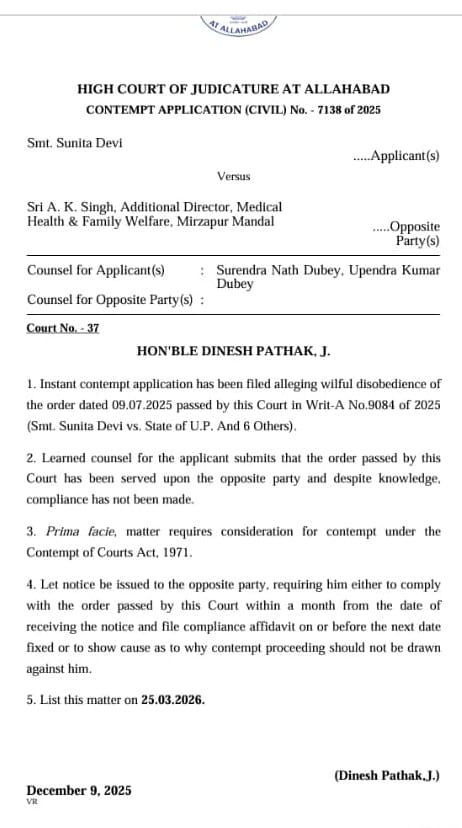 अवमानना रिट संख्या 7138 सन् 2025 माननीय उच्च न्यायालय की एकल खंडपीठ, न्यायमूर्ति दिनेश पाठक की अदालत में याचिकाकर्ती सुनीता देवी द्वारा दाखिल की गई। याचिका में याचिकाकर्ती की ओर से अधिवक्ता उपेंद्र कुमार दुबे ने अवगत कराया कि माननीय उच्च न्यायालय द्वारा पारित आदेश दिनांक 09.07.2025 का त्वरित अनुपालन नहीं किया गया है।
